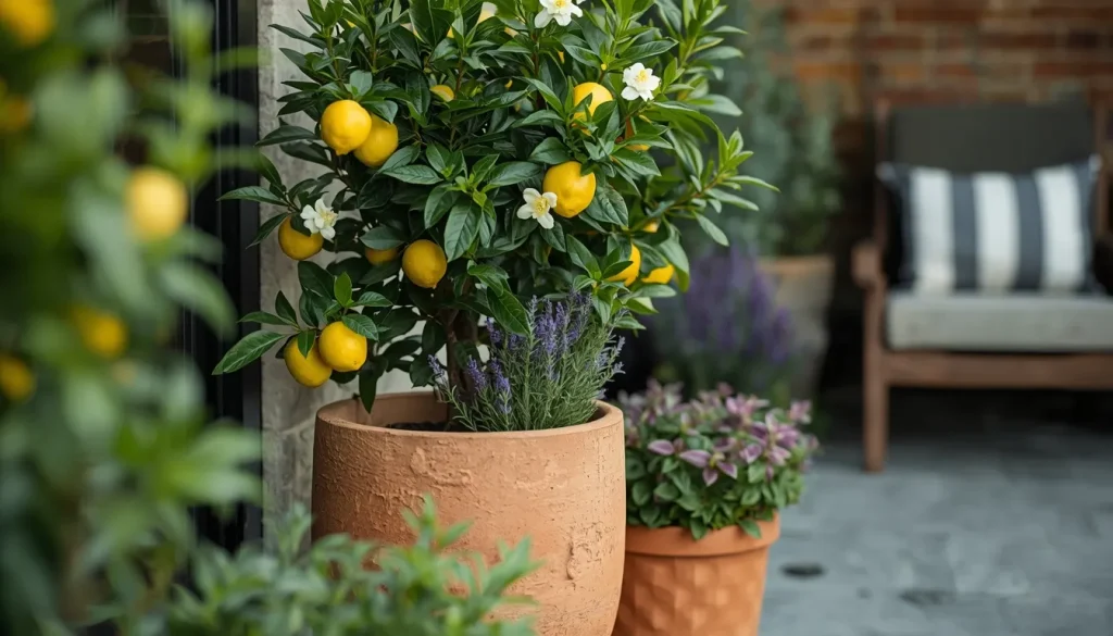Citrus trees are perhaps the most luxurious plants you can use to integrate fruits and herbs into a seating area. Varieties like Meyer lemons or calamondin oranges stay small but produce high yields of bright fruit and incredibly fragrant blossoms. Placing these trees in large stone or ceramic pots instantly elevates the atmosphere with a Mediterranean feel. The glossy evergreen leaves provide year round structure while the pops of yellow and orange fruit serve as natural decorative accents.
