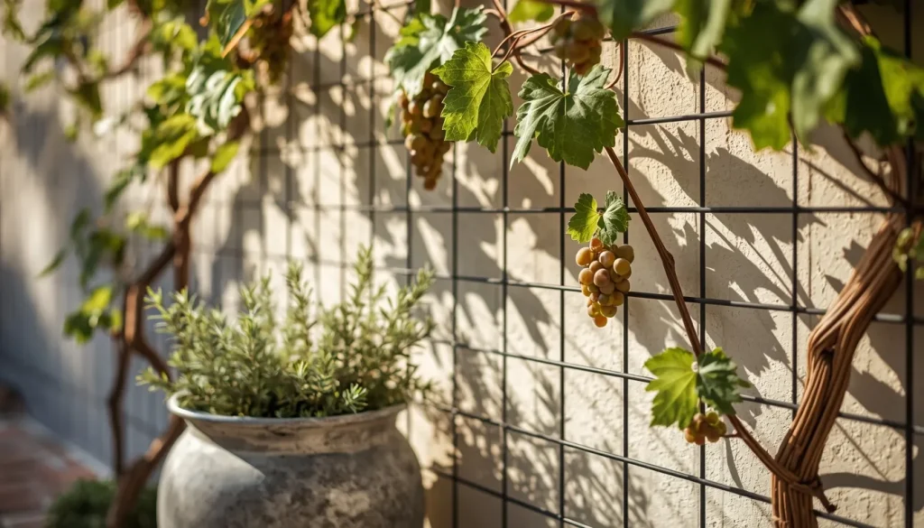Vertical structures offer a magnificent opportunity to integrate fruits and herbs while adding height to your patio design. Using contemporary trellises made of dark wood or minimalist wire frames allows you to train grapes or kiwis to grow in specific patterns. These climbing plants act as natural privacy screens and provide soft dappled shade during the warmer months. By carefully directing the growth of these vines you turn a productive plant into a sophisticated architectural feature that frames your outdoor view perfectly.