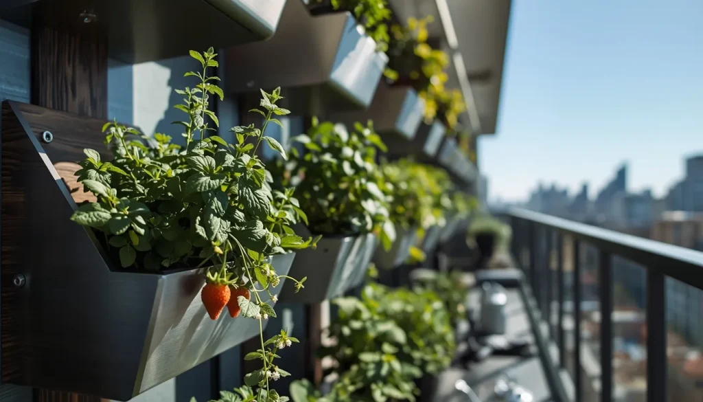 Wall mounted containers are perfect for creating a concentrated herb station. You can integrate fruits and herbs like trailing strawberries and creeping rosemary into these systems to create a cascading effect. Using sleek materials such as terracotta, brushed metal, or minimalist ceramics ensures that the hardware matches the sophisticated aesthetic of your home. This vertical arrangement keeps your most used kitchen staples within easy reach while acting as a fragrant piece of living art.